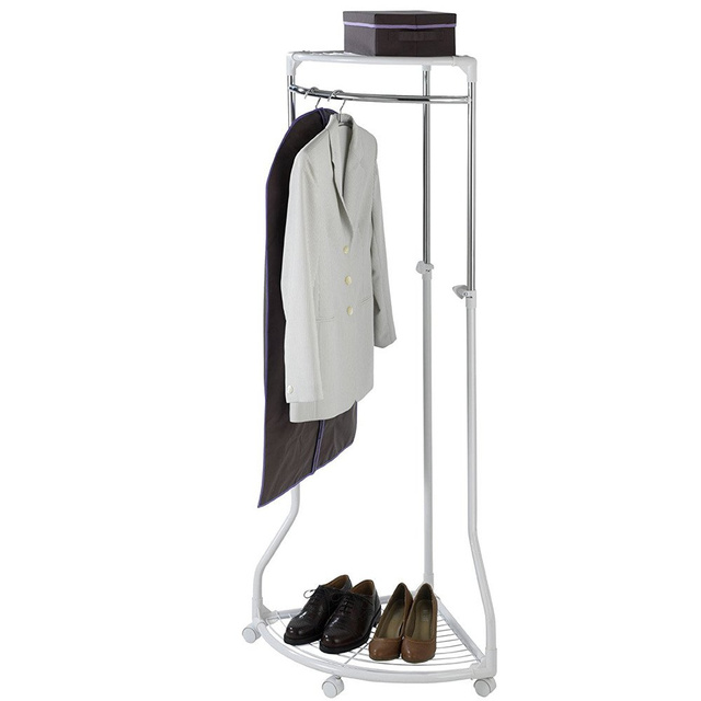 Praktyczny, narożny wieszak na ubrania. Wyposażony w dwie półki do przechowywania. Dolna - idealna do przechowywania obuwia, górna doskonale sprawdzi się do układania kartonów czy kapeluszy. Przeznaczony do przechowywania, suszenia lub wietrzenia ubrań - kurtek, płaszczy, koszul itp. Sprawdzi się w każdym domu lub biurze. Możliwość regulacja wysokości, pozwala dopasować wieszak do indywidualnych potrzeb. Nie zajmuje wiele miejsca. Wyposażony w 4 kółka, dzięki którym szybko można go przestawić w dowolne miejsce. Dwa kółka wyposażone są w hamulec, który zabezpieczy przed niechcianym przesuwaniem się wieszaka.Solidne wykonanie. Stabilna i wytrzymała konstrukcja z metalu pozwala na przechowywanie rzeczy do 50 kg.