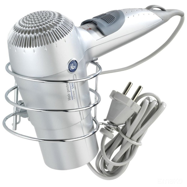 Klasyczny uchwyt na suszarkę do włosów. Wykonany z chromowanej stali. Pomoże utrzymać suszarkę w łatwo dostępnym miejscu pod ręką. Wyposażony w zintegrowany uchwyt na kabel. Elegancki designdoskonale pasuje do każdej łazienki. Montaż za pomocą załączonych śrub i kołków. Alternatywny montaż z adapterami Vacuum-Loc, Turbo-Loc oraz Power-Loc. Średnica otworu wynosi 9,5 cm.